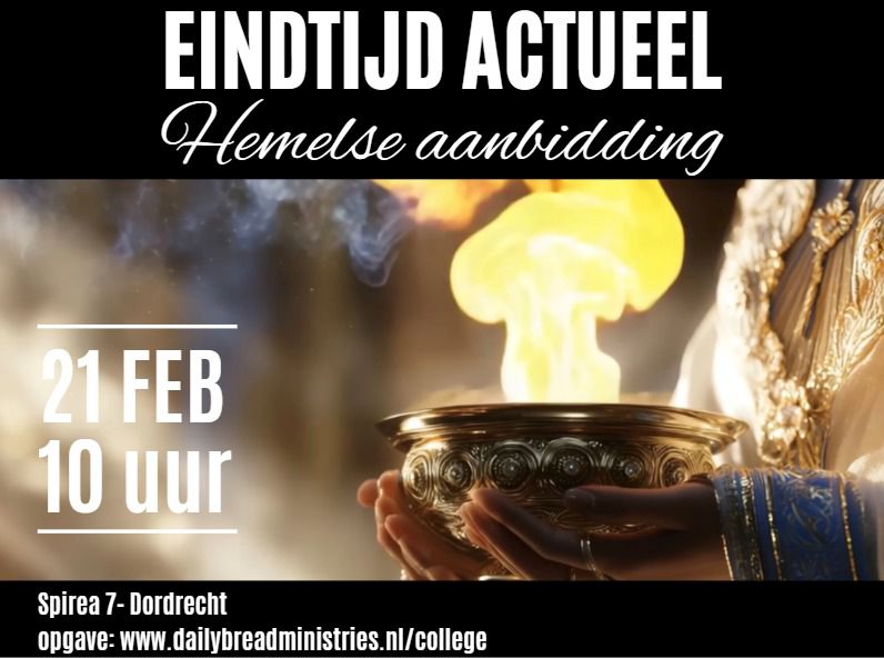 Op zaterdag 21 februari is er weer een studie ochtend ‘Eindtijd Actueel’.We zullen ons verdiepen in een heel interessant thema namelijk; hemelse aanbidding. De Bijbel spreekt op vele plaatsen over aanbidding en met name de Psalmen nemen ons mee in de diverse vormen van aanbidding. Het onderscheidt zich echter met het Boek Openbaring op een bijzondere manier en daar gaan we de 21e uitgebreid op in. Kortom, een uniek thema dat aandacht verdient en iedereen zou moeten begrijpen.We hopen dat je deze datum al vast in je agenda zet en de opgave kan via de bekende site; www.dailybreadministries.nl/collegeBert en Nancy de Haan